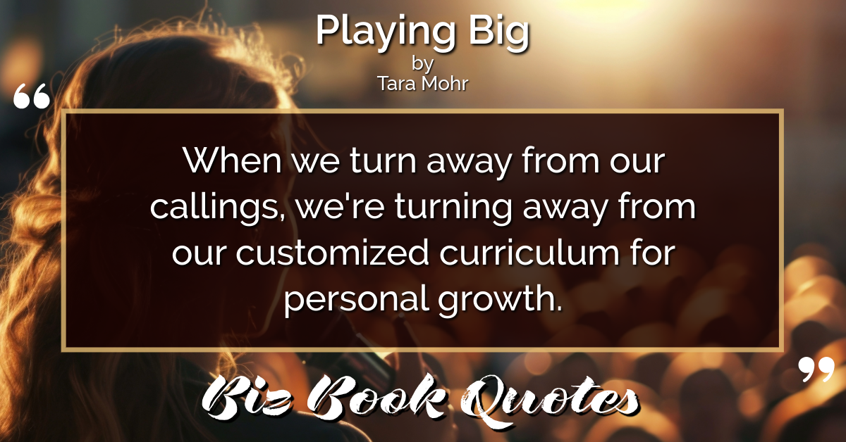 Categories Callings Quotes: 4 Quote(s) Found Quote Page Number A calling… is a longing to address a particular need or problem in the world. 201 Following our callings is one of the most important and fulfilling ways we can play bigger. 203 When we turn away from our callings, we’re turning away from our customized curriculum for personal growth. 207 …the small number of hours spent on [callings] each week changes the way we experience every moment of our lives. 210
