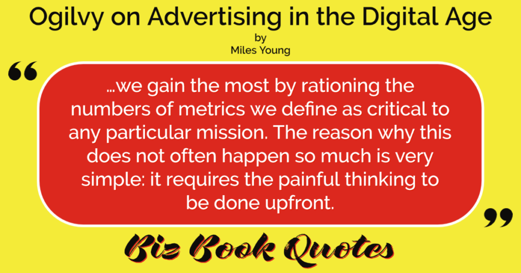 Quotes Quote: …we gain the most by rationing the numbers of metrics we define as critical to any particular mission. The reason why this does not often happen so much is very simple: it requires the painful thinking to be done upfront.