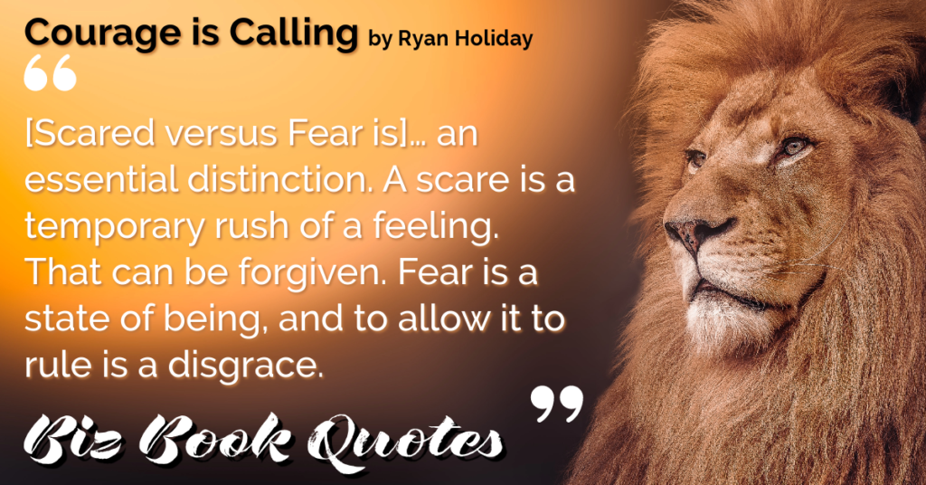 Quotes Quote: [Scared versus Fear is]… an essential distinction. A scare is a temporary rush of a feeling. That can be forgiven. Fear is a state of being, and to allow it to rule is a disgrace.