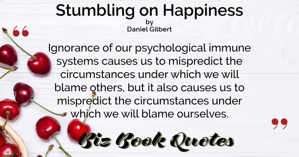 Quotes Quote: Ignorance of our psychological immune systems causes us to mispredict the circumstances under which we will blame others, but it also causes us to mispredict the circumstances under which we will blame ourselves.