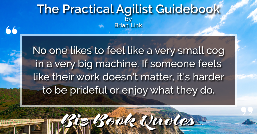 Quotes Quote: No one likes to feel like a very small cog in a very big machine. If someone feels like their work doesn’t matter, it’s harder to be prideful or enjoy what they do.