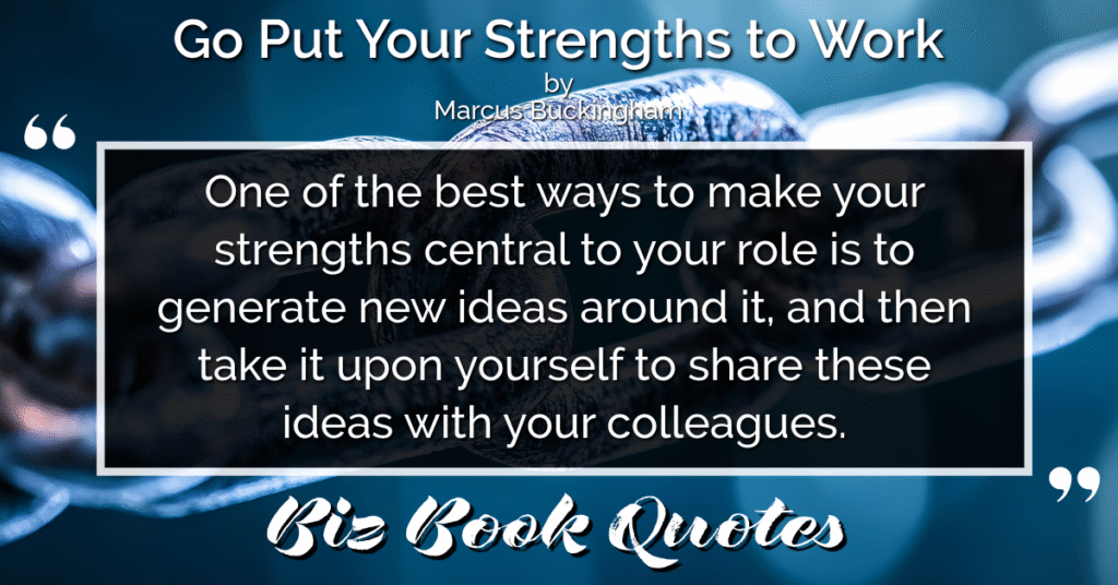 Quotes Quote: One of the best ways to make your strengths central to your role is to generate new ideas around it, and then take it upon yourself to share these ideas with your colleagues.