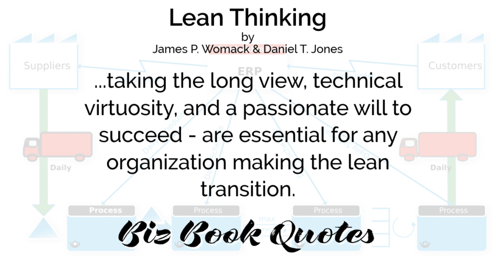 Quotes Quote: …taking the long view, technical virtuosity, and a passionate will to succeed – are essential for any organization making the lean transition.