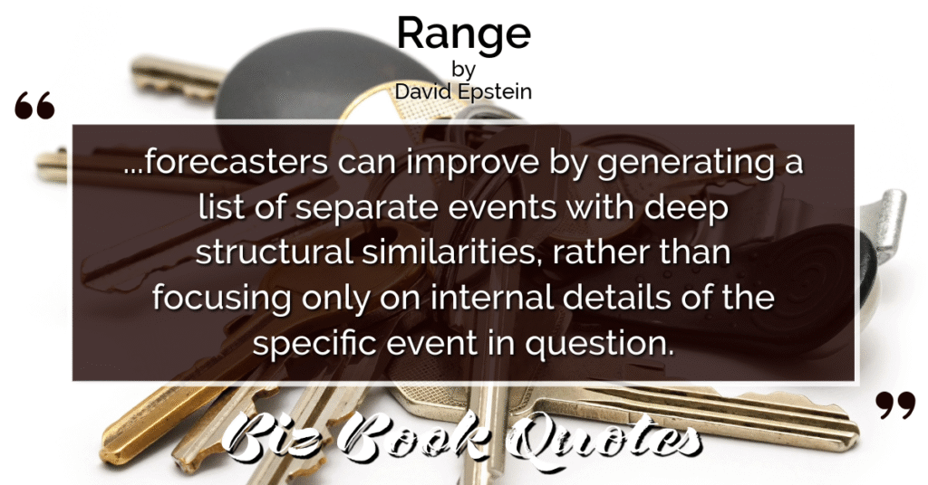 Quotes Quote: …forecasters can improve by generating a list of separate events with deep structural similarities, rather than focusing only on internal details of the specific event in question.