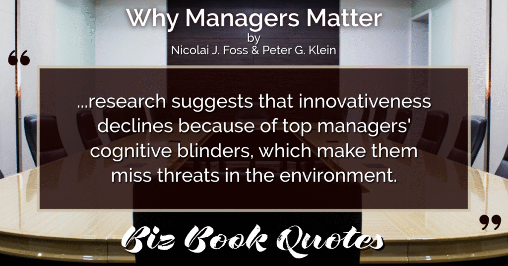 Quotes Quote: …research suggests that innovativeness declines because of top managers’ cognitive blinders, which make them miss threats in the environment.
