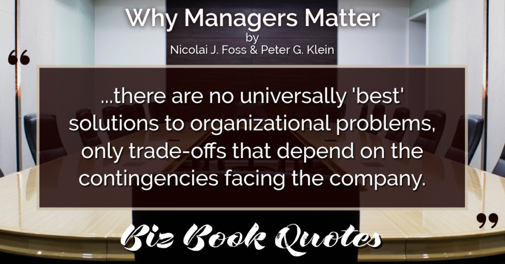 Quotes Quote: …there are no universally ‘best’ solutions to organizational problems, only trade-offs that depend on the contingencies facing the company.