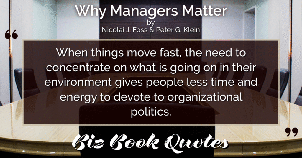 Quotes Quote: When things move fast, the need to concentrate on what is going on in their environment gives people less time and energy to devote to organizational politics.