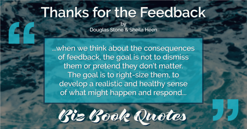 Quotes Quote: …when we think about the consequences of feedback, the goal is not to dismiss them or pretend they don’t matter. The goal is to right-size them, to develop a realistic and healthy sense of what might happen and respond…