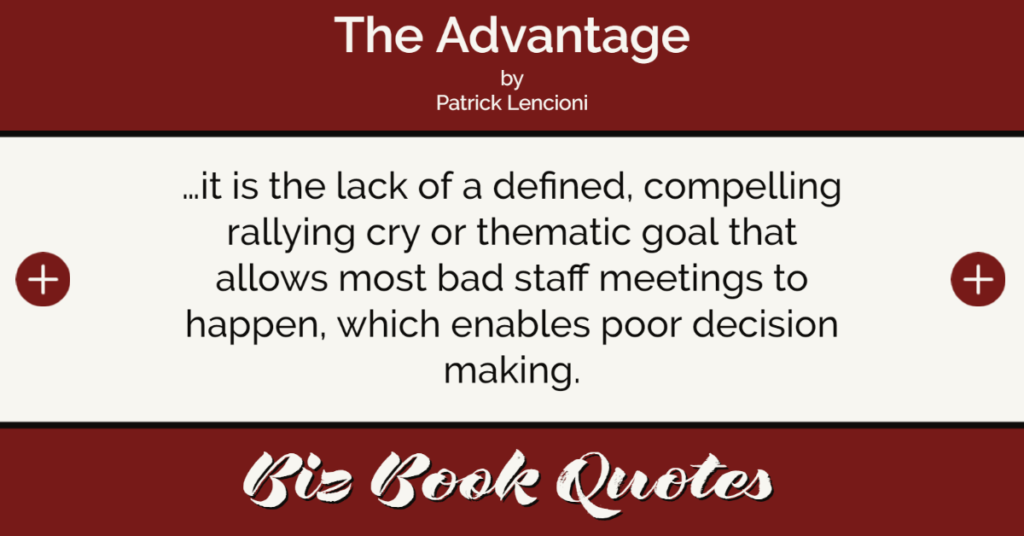 Quotes Quote: …it is the lack of a defined, compelling rallying cry or thematic goal that allows most bad staff meetings to happen, which enables poor decision making.