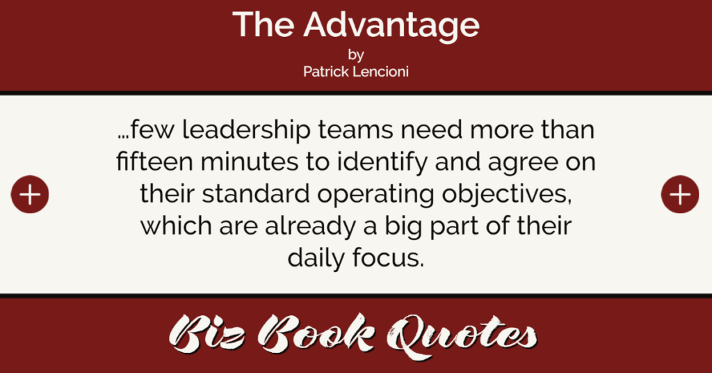 Quotes Quote: …few leadership teams need more than fifteen minutes to identify and agree on their standard operating objectives, which are already a big part of their daily focus.