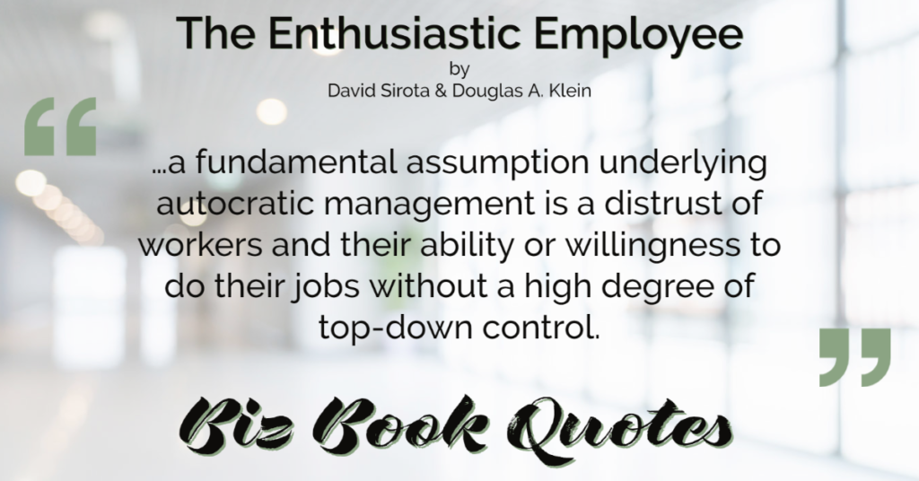 Quotes Quote: …a fundamental assumption underlying autocratic management is a distrust of workers and their ability or willingness to do their jobs without a high degree of top-down control.