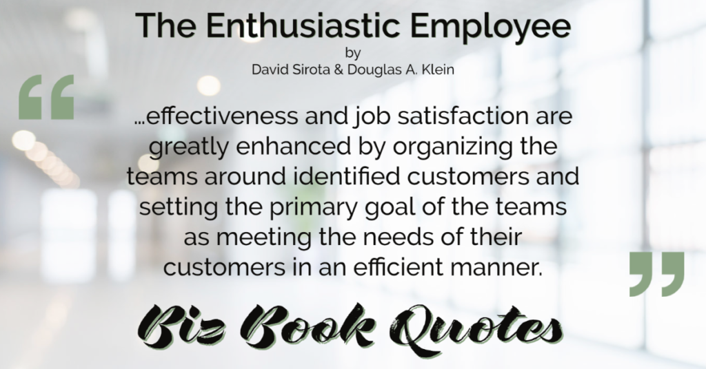 Quotes Quote: …effectiveness and job satisfaction are greatly enhanced by organizing the teams around identified customers and setting the primary goal of the teams as meeting the needs of their customers in an efficient manner.