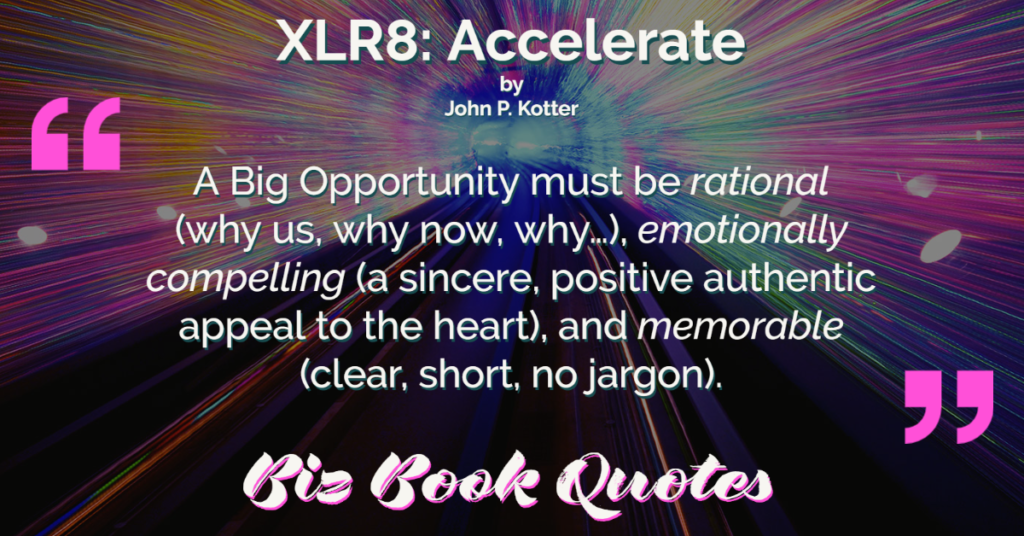 Quotes Quote: A Big Opportunity must be rational (why us, why now, why…), emotionally compelling a sincere, positive authentic appeal to the heart), and memorable (clear, short, no jargon).
