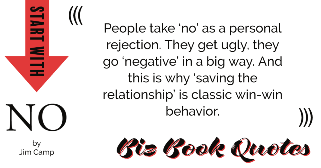 Quotes Quote: People take ‘no’ as a personal rejection. They get ugly, they go ‘negative’ in a big way. And this is why ‘saving the relationship’ is classic win-win behavior.