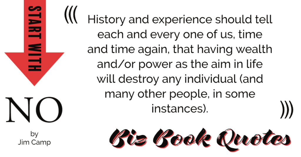 Quotes Quote: History and experience should tell each and every one of us, time and time again, that having wealth and/or power as the aim in life will destroy any individual (and many other people, in some instances).