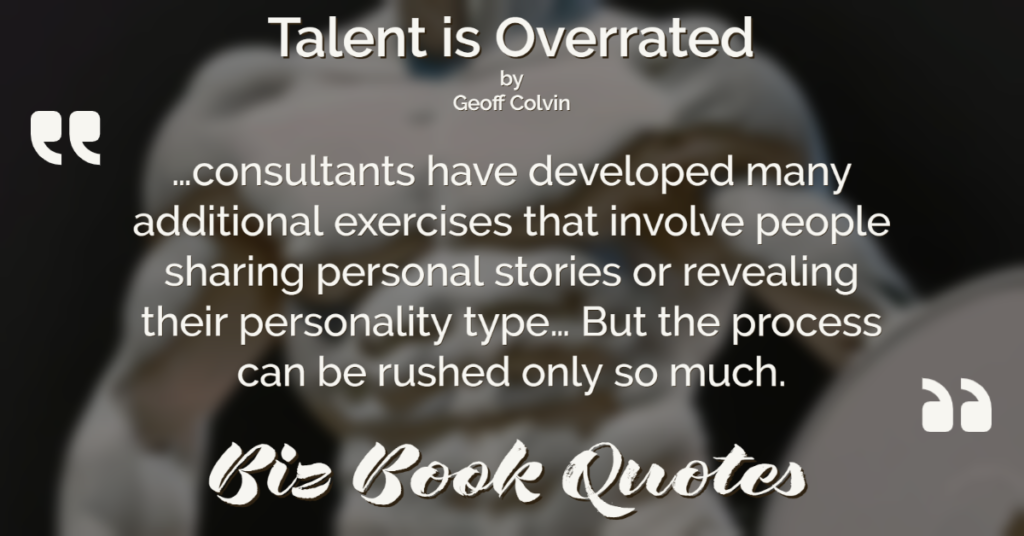 Quotes Quote: …consultants have developed many additional exercises that involve people sharing personal stories or revealing their personality type… But the process can be rushed only so much.