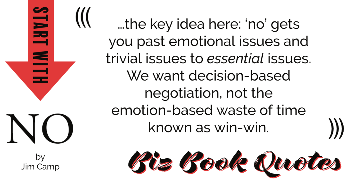 …the key idea here: ‘no’ gets you past emotional issues and trivial issues to essential issues. We want decision-based negotiation, not the emotion-based waste of time known as win-win.